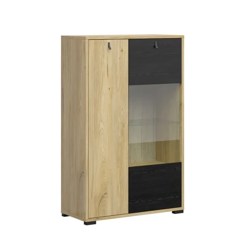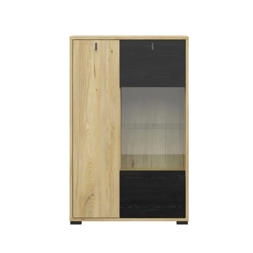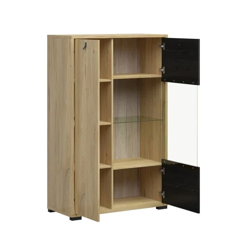 Vaisselier 2 portes Dena Bois et Noir Fabrication Européenne – Collection : Dena – Matériaux : Panneaux agglomérés – Vitrine en verre trempés – Couleur : Bois façon chêne – Noir avec nervures du bois apparentes – Caractéristiques : 2 portes dont 1 vitrée – 6 étagères dont 1 en verre – Portes équipés du système de fermeture silencieuse – Poids et Dimensions : 58kg – 90 x 40 x 140cm – Produit livré, à monter – Produit garanti 12 Mois.