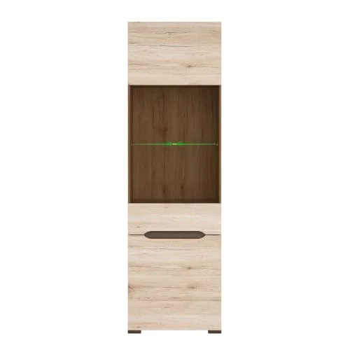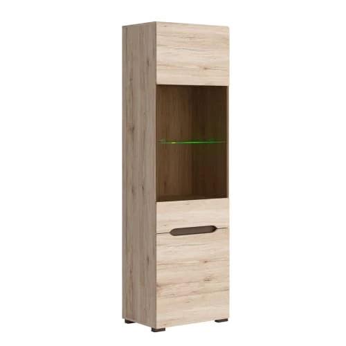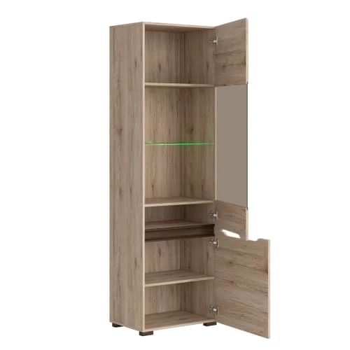 Vitrine 2 portes Rico Bois Fabrication Européenne – Collection: RICO – Matériaux : Panneaux agglomérés – Vitrine et étagères en verre trempé – Couleur: Bois façon chêne clair San Remo – Détail en bois façon Wenge – Caractéristiques: 2 portes dont 1 vitrée – 5 étagères dont 1 en verre – LED – Non inclus – Poids et Dimensions : 56 kg – 60 x 41 x 200 cm – Produit garanti 12 Mois. – Produit livré, à monter