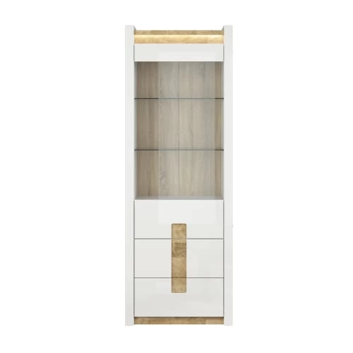 Vitrine 1 porte 2 tiroirs avec LED Helios Blanc laqué et Bois Fabrication Européenne – Collection : Helios – Couleur : Blanc laqué – Bois façon chêne Westminster – Matériaux : Panneaux MDF et de particules – Vitrine et étagère en verre trempé – Caractéristiques : 1 porte vitrée – 2 tiroirs – 2 étagères en verre trempé – 1 étagère – LED à brancher sur prise secteur avec un bouton- Portes équipées du système de fermeture silencieuse – Poids et dimensions : 68 kg – 72 x 42 x 202 cm – Produit livré, à monter – Produit garanti 12 Mois.
