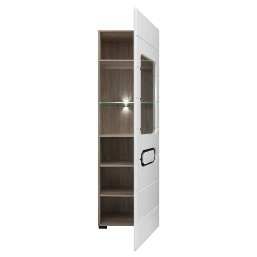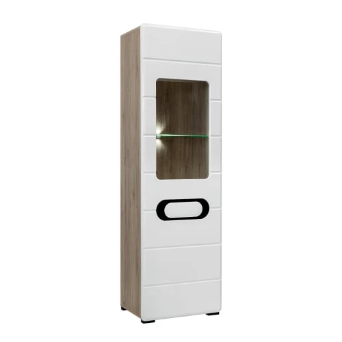 Vitrine 1 porte avec LED Bruno Blanc et Noir laqué Fabrication Européenne – Collection : Bruno – Couleur : Blanc et noir laqué – Côté : bois façon Chêne San Remo – Matériaux : Panneaux MDF et de particules – Ellipse noir en verre trempé – Poids et dimensions : 56 kg – 60 x 42 x 195 cm – Produit livré, à monter – Produit garanti 12 Mois. – Caractéristiques : 1 porte vitrée – 1 étagère en verre – 5 étagères dont 2 amovibles et réglables en hauteur – LED à brancher sur prise secteur avec un bouton -e Porte équipée du système de fermeture silencieuse