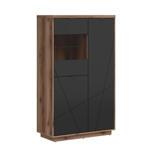 Vitrine 3 portes Sven Noir et Bois Fabrication Européenne – Collection : Sven – Couleur : Noir et bois – Matériaux : Panneaux mélaminés – Poignées métalliques – Caractéristiques : 3 portes dont 1 porte vitrée – 1 étagère en verre trempé – 8 niches de rangement – Portes équipées du système de fermeture silencieuse LED non inclus – Poids et dimensions : 63 kg – 94 x 43 x 157 cm – Produit livré, à monter – Produit garanti 12 Mois.