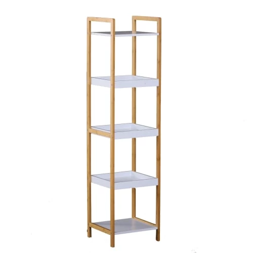 – Étagère de salle de bain bicolore bambou et blanc, idéale pour ajouter une touche cosy zen et naturelle à votre salle de bain