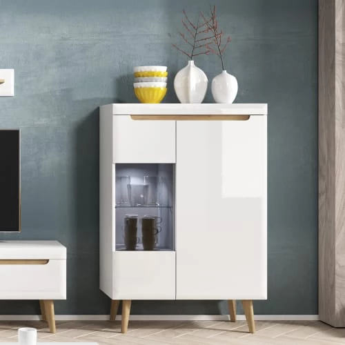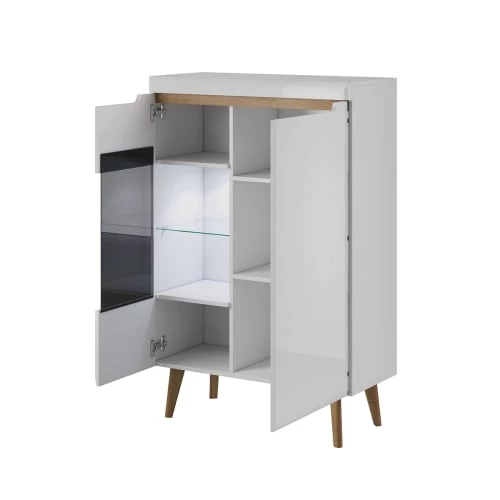 Vaisselier 2 portes Lana Blanc et Bois Fabrication Européenne – Collection : Lana – Matériaux : Panneaux agglomérés – Vitrine et étagère en verre trempé – Couleur : Blanc laqué Bois façon chêne riviera – Caractéristiques : 2 portes dont 1 vitrée – 5 étagères dont 1 en verre trempé – Poids et dimensions : 47 kg – 90 x 40 x 134 cm – Produit livré, à monter, notice incluse – Produit garanti 24 mois