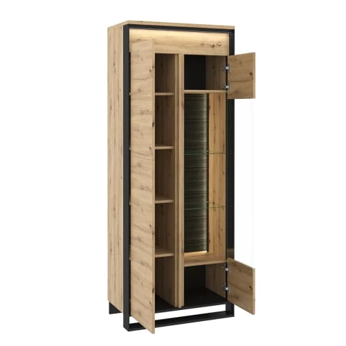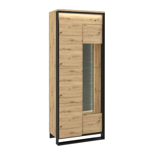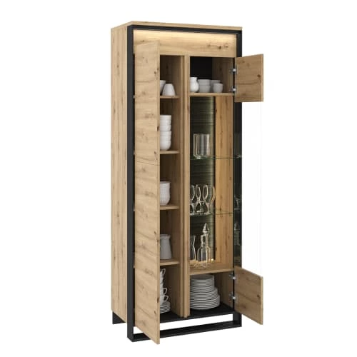 Vaisselier 2 portes avec LED Storm Bois et Noir Fabrication Européenne – Collection : Storm – Matériaux: Panneaux de particules stratifiés – Composé de bois géré durablement – Vitrine et étagères en verre trempé – Couleur : Bois façon chêne – Détails noir mat – Caractéristiques: 2 portes dont 1 vitrée – 8 étagères dont 2 en verre – Bande LED externe – Inclus – LED interne – Inclus – LED à brancher sur prise secteur avec un bouton allumer / éteindre – Ouverture avec le système « Push to open » – Portes équipées du système de fermeture silencieuse – Poids et dimensions : 64 kg – 76 x 41 x 195 cm – Produit livré, à monter, avec notice incluse – Produit garanti 24 Mois