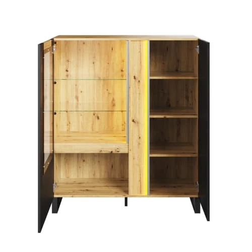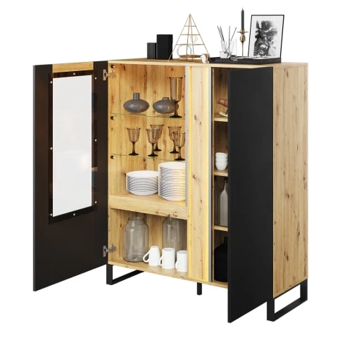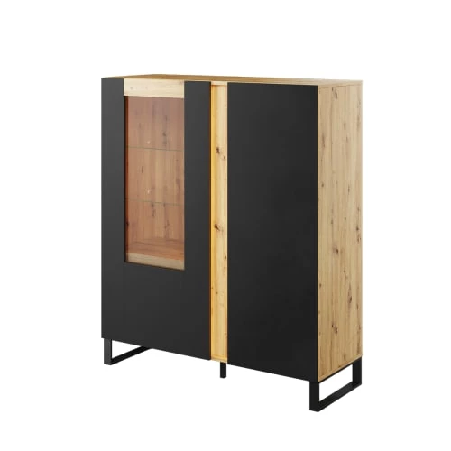 Vaisselier bas 2 portes avec LED August Bois et Noir Fabrication Européenne – Collection : August – Couleur: Noir mat – Bois façon chêne – Matériaux: Facade en panneaux MDF – Corps en panneaux de particules stratifiés – Composé de bois géré durablement – Pieds en métal – Caractéristiques: 1 porte vitrée – 6 étagères dont 4 en verre – LED directionnelle – Incluse – LED à brancher sur prise secteur avec un bouton allumer / éteindre – Poids et dimensions : 57 kg – 110 x 41 x 130 cm – Produit livré, à monter, avec notice incluse – Produit garanti 24 Mois