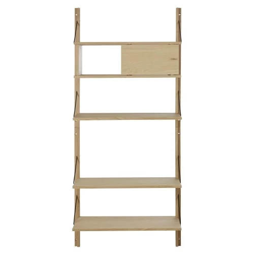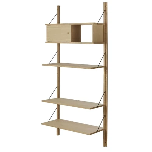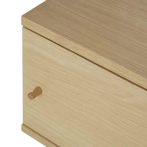 Etagères (3 amovibles et ajustables), côtés, arrière et porte du caisson : panneaux de particules et placage chêne, finition claire