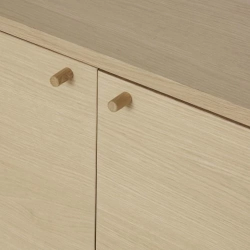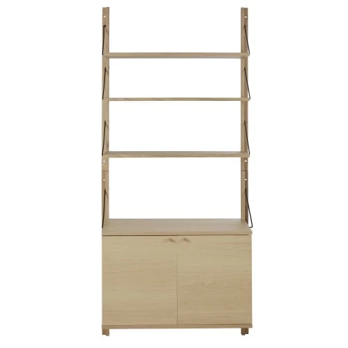 Etagères (3 amovibles et ajustables + 1 étagère amovible à l’intérieur du caisson), côtés, arrière et portes (2) du caisson : panneaux de particules et placage chêne, finition claire
