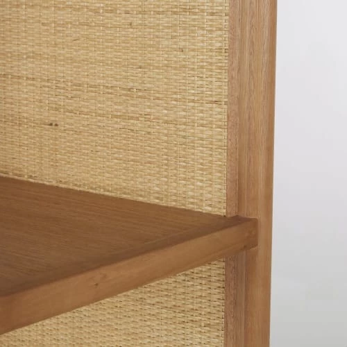 Panneaux de fond: panneaux de fibres de moyenne densité (E1) : tressage rotin partie visible et panneaux de particules placage eucalyptus teinté noisette, finition vernis acrylique transparent mat en face arrière