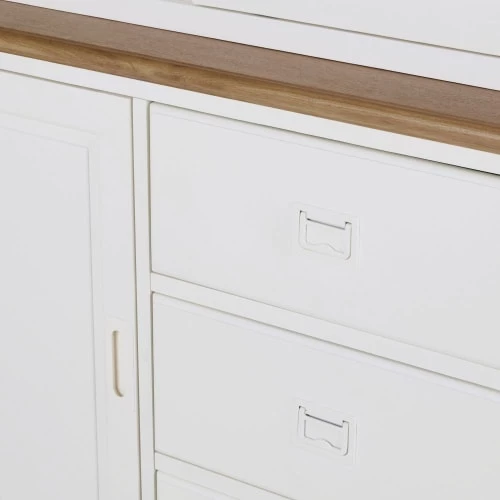 Doté d’une partie haute vitrée avec 2 étagères fixes, le bahut blanc LEANDRE vous permettra de visualiser plus facilement votre vaisselle. Dans la partie basse, ce bahut blanc vous offre 3 tiroirs et une étagère fixe à l’intérieur de chaque porte. Le détail déco : les poignées en métal qui modernisent le meuble. Notre conseil : glissez des petits paniers sur les étagères pour compartimenter vos rangements.