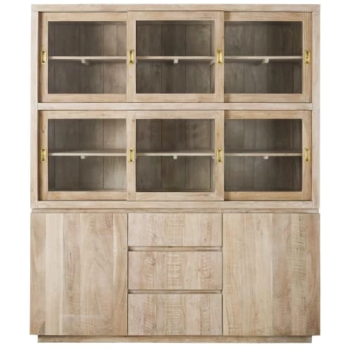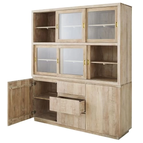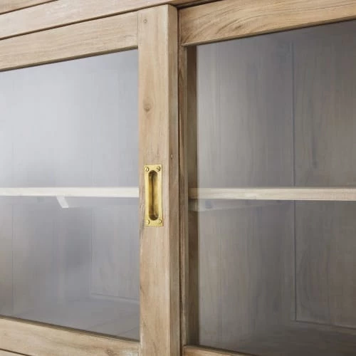 Portes coulissantes du haut : verre trempé et acacia massif, vernis nitrocellulosique transparent, finition légèrement blanchie