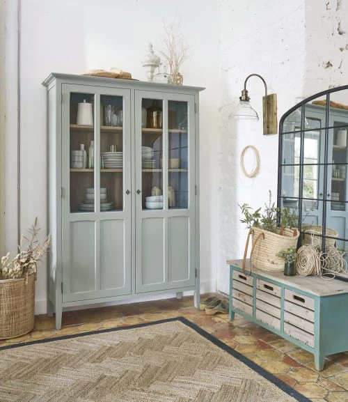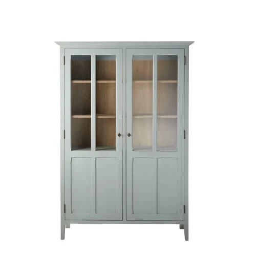 Portes : pin, panneau de fibres de moyenne densité (E1),et verre trempé (épaisseur 5mm), peinture acrylique coloris vert de gris, finition mate