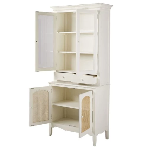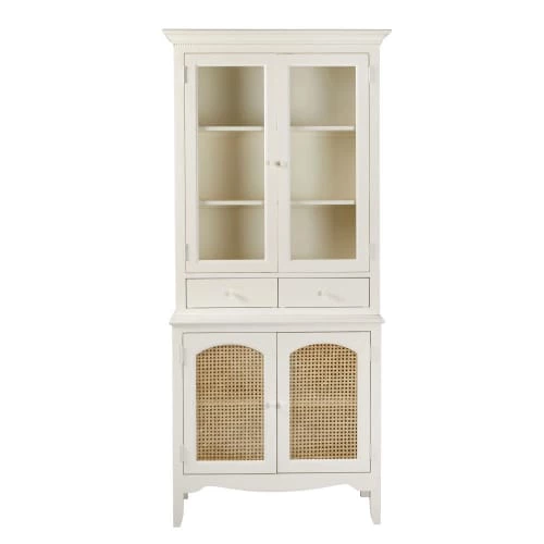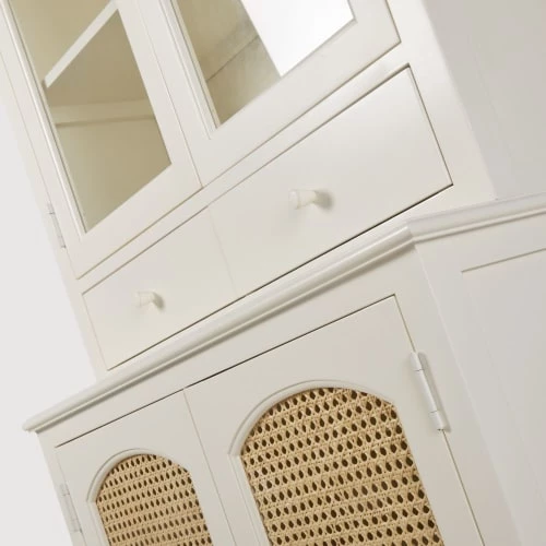 Façade portes partie basse : cadre en panneaux de fibres de moyenne densité E1, peinture acrylique coloris blanc cassé finition mate, rotin tressé, finition vernis acrylique transparent