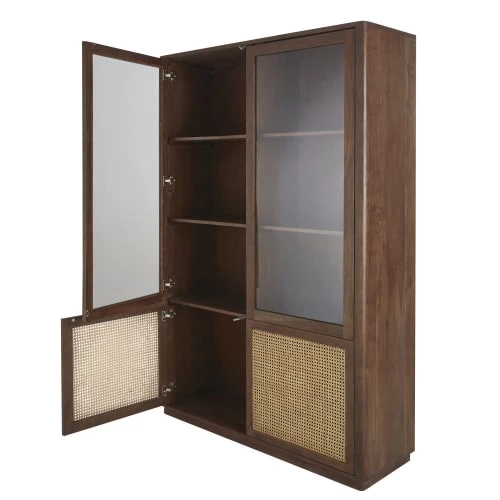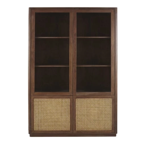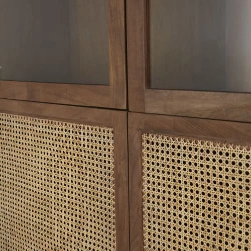 Portes (partie basse) : contours en acacia massif finition teintée noisette et vernis nitrocellulosique, intérieur en cannage rotin