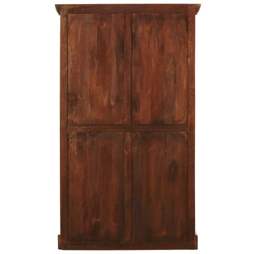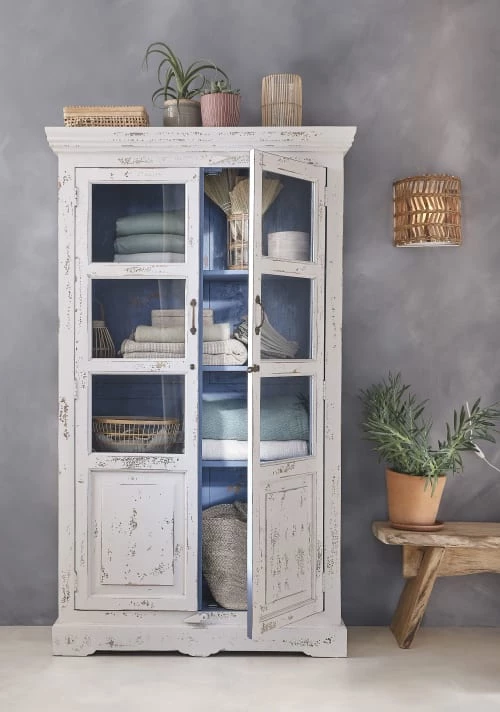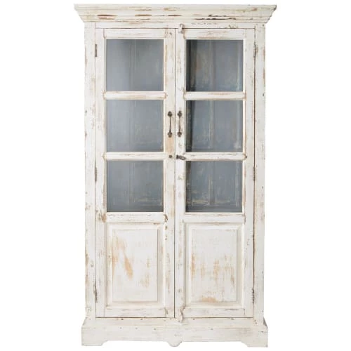 Ce meuble vitrine est en bois de manguier et a été travaillé avec une patine blanche et un effet très vieilli.