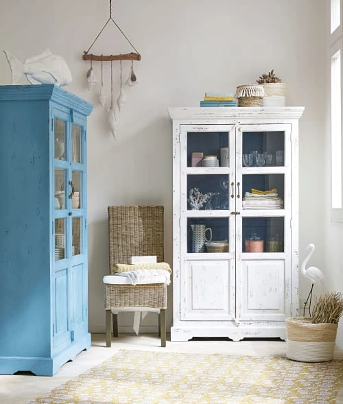 Cette vitrine en bois patiné se décline aussi en bleu turquoise.