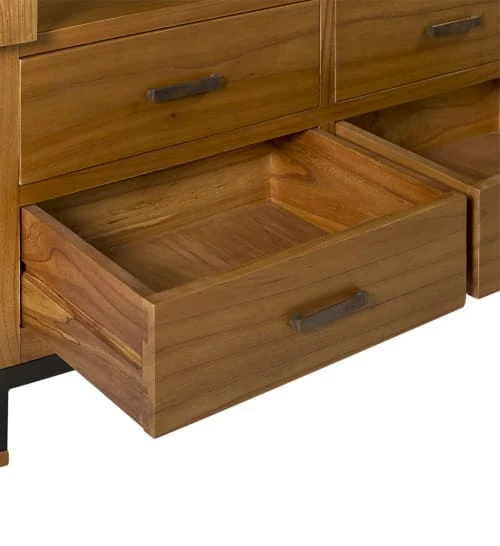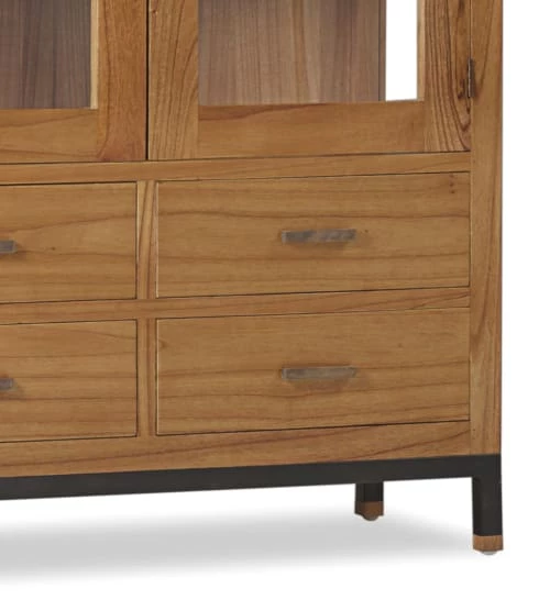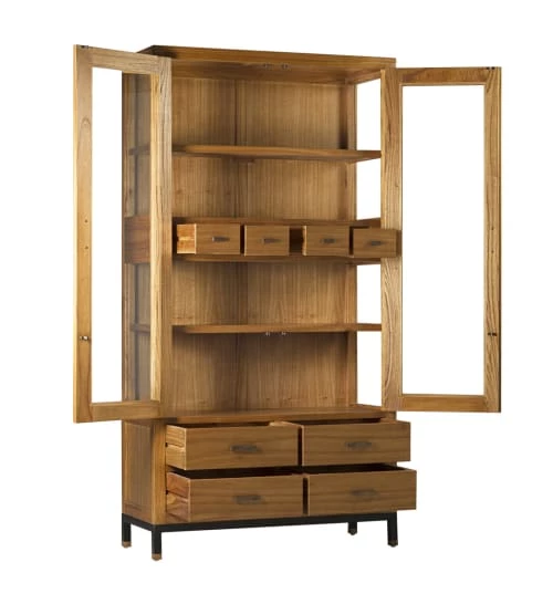 Vitrine de la collection MADHU de style colonial et moderne. Elle est fabriquée à la main en bois de mindi, métal noir, des des accessoires en bronze et structure massive. Avec 8 tiroirs et 2 portes vitrées avec étagères et tiroirs, ce meuble vous offre beaucoup d’espace de rangement. Contient un tiroir secret où vous pourrez ranger vos biens les plus précieux. L’assemblage des pieds est nécessaire.