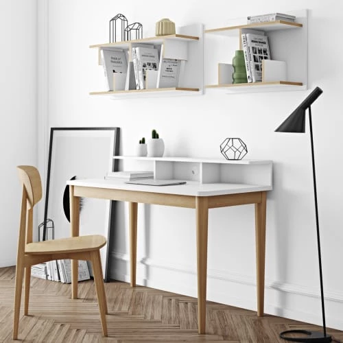 Matériaux : Panneaux de particules mélaminés majoritairement à base de bois recyclé. Finition laquée avec champs en placage bois effet contreplaqué.