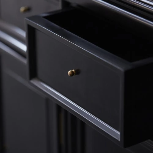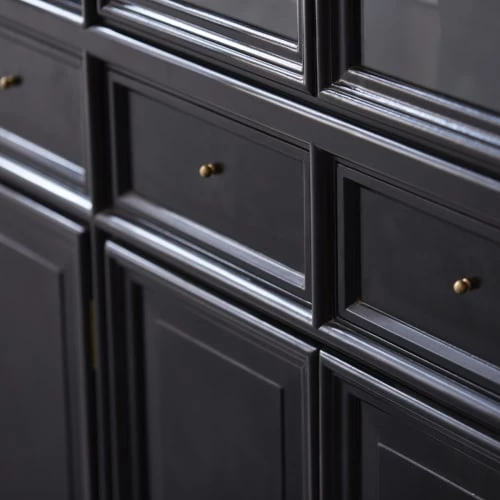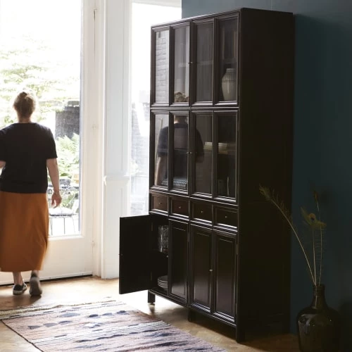 Vaisselier en acajou peint en noir.Info : 2x 2 portes vitrées ouvrant sur 2 niveaux (dimensions étagères H 27,5 x L 52 x P 36 cm) / 4 tiroirs (H 10 x L 23,5 x P 32 cm – rail bois) / 2 x 2 portes pleines ouvrant sur 2 niveaux (H 26 x L 51 x P 36 cm) / meuble en 2 partiesAssemblage requis- notice fournieStructure acajou, panneaux MDFInformations Produit :Matière : AcajouDimensions : H 210 x L 120 x P 41 cmPoids : 78 kg environAcheter un meuble Tikamoon, c’est acheter une pièce exclusive, dessinée avec passion par nos équipes. Concepteur de mobilier d’intérieur, Tikamoon propose des collections exclusives de meubles en bois massif.