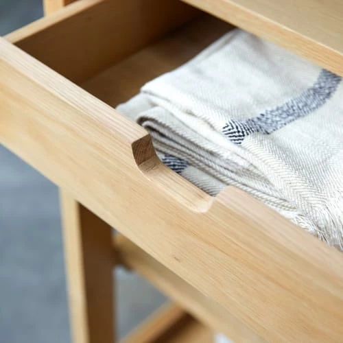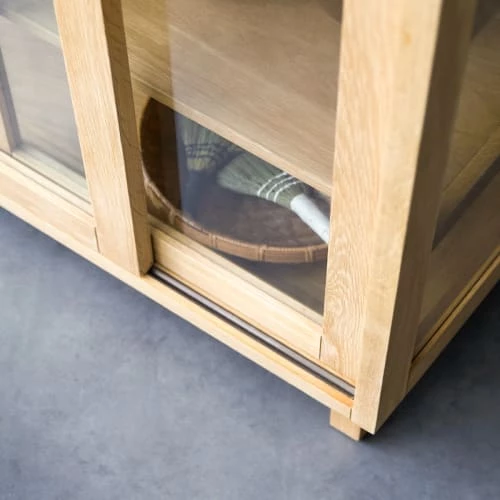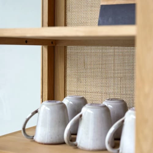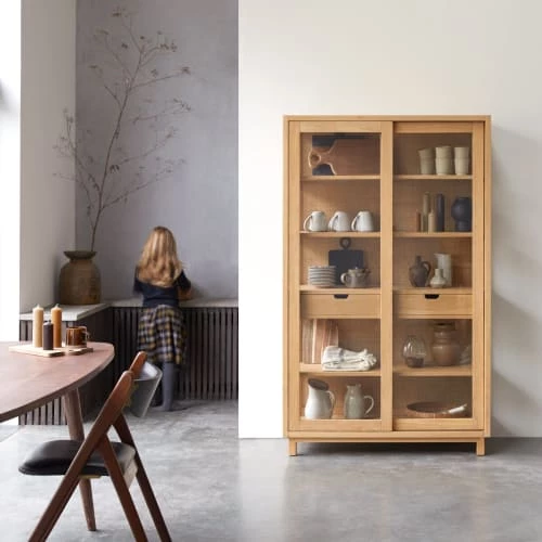 Le vaisselier Adel en chêne massif, un grand meuble vitré idéal pour le rangement, de la marque Tikamoon!Esprit naturel et praticité, il offre 5 étagères et 2 tiroirs – idéal pour ranger le linge, la vaiselle ou les objets déco. *Le fond est recouvert d’un cannage en rotin.* 5 étagères (H 28.6 x L 104 x P 33 cm) / 2 tiroirs (H 8 x L 45 x P 23.5 cm – rails invisibles) / Hauteur pieds : 10 cmInformations Techniques :Matière : chêneDimensions : H 180 x L 110 x P 45 cmPoids : 102.7 kgAcheter un meuble Tikamoon, c’est acheter une pièce exclusive, dessinée avec passion par nos équipes. Concepteur de mobilier d’intérieur, Tikamoon propose des collections exclusives de meubles en bois massif.