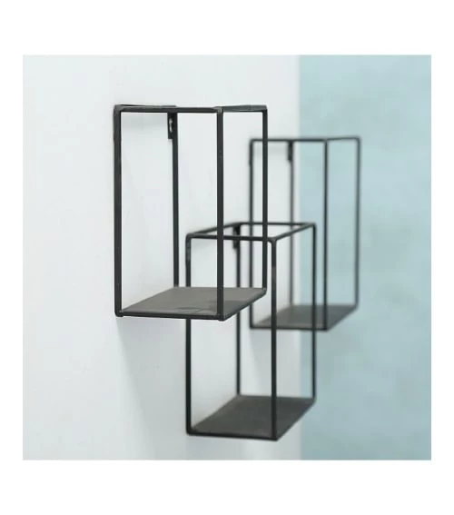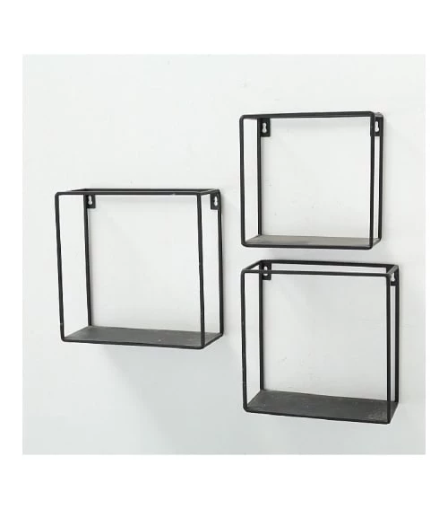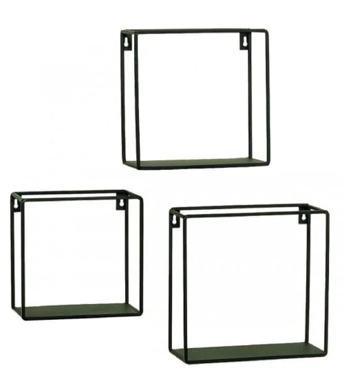 Set de 3 étagères murales en métal noir. Ces étagères épurées et tendances conviennent aussi bien pour une entrée que pour un salon ou une chambre. Ce set de 3 étagères vous permet de ranger, organiser et décorer de manière élégante et pratique. Ces 3 étagères murales peuvent aussi bien faire office de bibliothèque que d’étagères vitrine dans lesquelles vous déposez vos objets déco. Dimensions: 8x16x16cm / 8x18x18cm / 8x20x20cm – Couleur: Noir – Matière: Métal