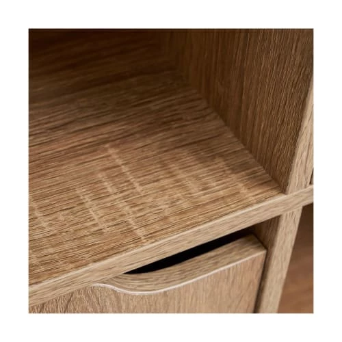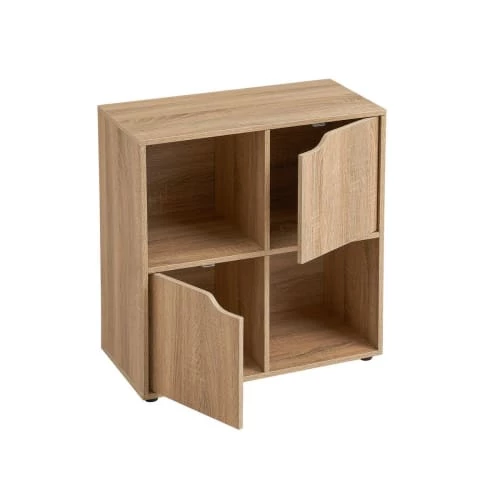 Étagère basse étroite en bois MDF avec ses 4 casiers de rangement et 2 portes. Idéale pour disposer des objets déco, de livres…. Livré à plat. Très facile à monter.