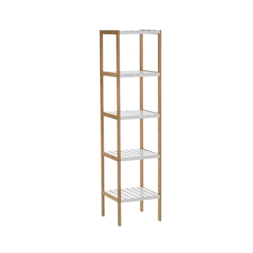 Étagère de salle de bain avec structure en bambou et étagères en bois MDF blanc. Espace entre les étagères: 27.5cm.Dimensions: 33x34x140cmCouleur: Bambou et blancMatière: Bambou et MDF