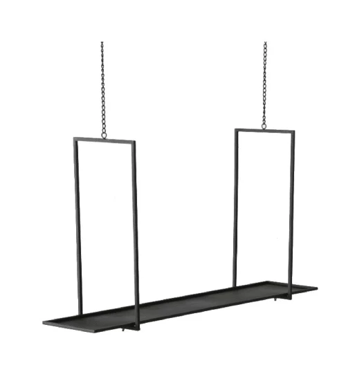 Étagère à suspendre en métal laqué noir. Cette étagère suspendue convient parfaitement pour suspendre au dessus d’une table et d’y disposer des bougies pour une déco chaleureuse assurée. Une étagère élégante et pleine de charme pour votre intérieure. Dimensions: Longueur 100cm x Hauteur totale 107.5cm (chaînette 52.5cm) x largeur 20cm – Couleur: Noir – Matière: Fer